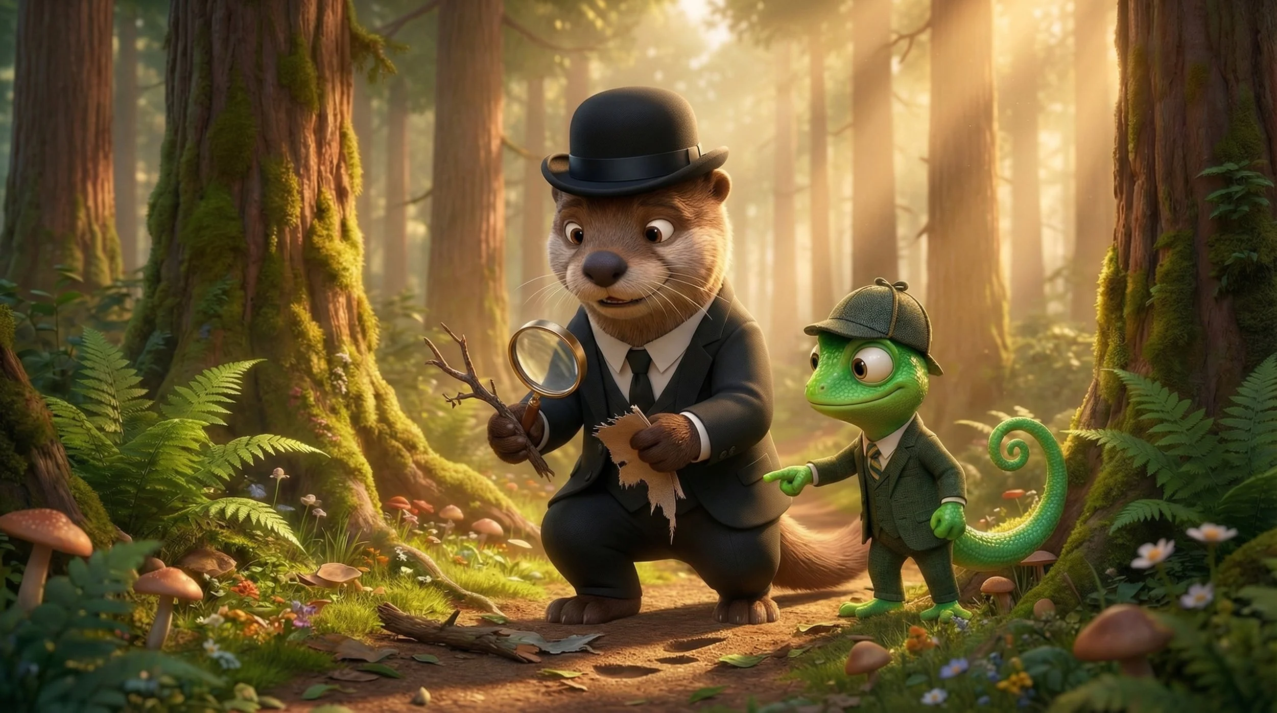 Animated otter dressed in a black suit and bowler hat walking down a cobblestone street in a cozy town, with storefronts and trees lining the street.