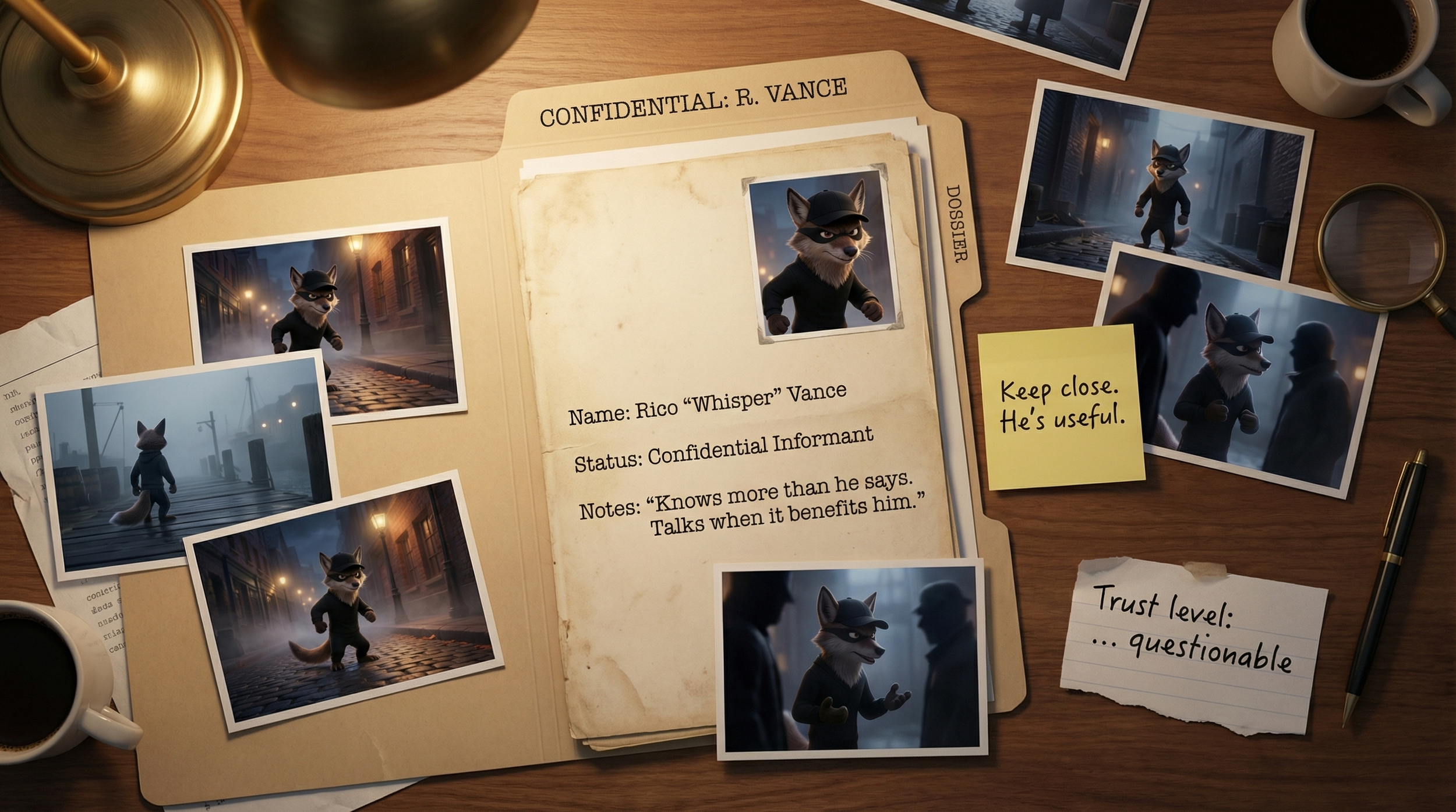 He wears the mask not just for style, but because in the Wharf, anonymity is currency. He’s useful, he’s fast, and he’s always one step ahead of a question. Waterson keeps a paw on his collar, and Sherlock keeps an ear to his lead, knowing that while Rico Vance might be questionable, his intel is usually gold. Just don't expect him to stick around for the paperwork.